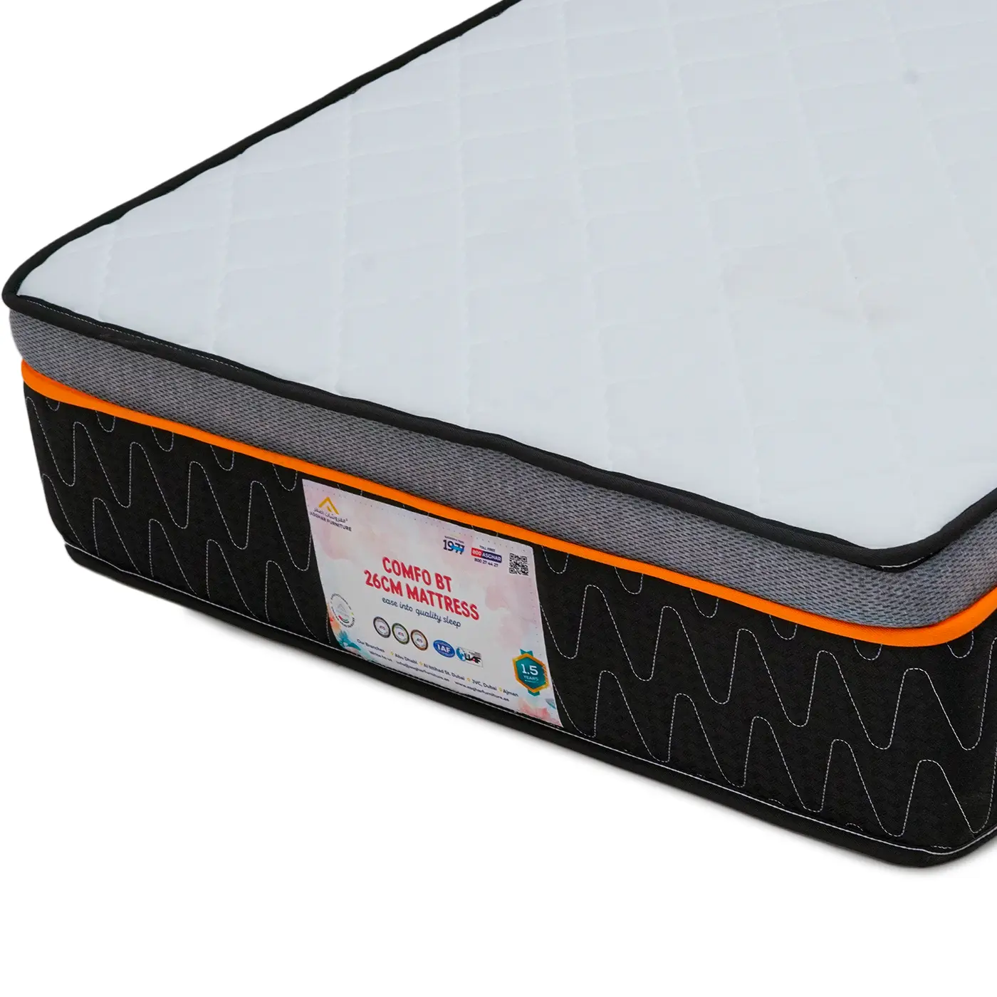 Experience the ideal balance of comfort and support with the Comfo BT 26CM Mattress. Built with a durable Bonnell spring system, it offers reliable support and long-lasting performance. The plush knitted fabric cover creates a soft, breathable sleep surface that enhances overall comfort. Designed with a box top for added cushioning, this mattress ensures consistent stability and pressure relief—perfect for a restful and rejuvenating night’s sleep. Backed by a 1.5-year warranty.