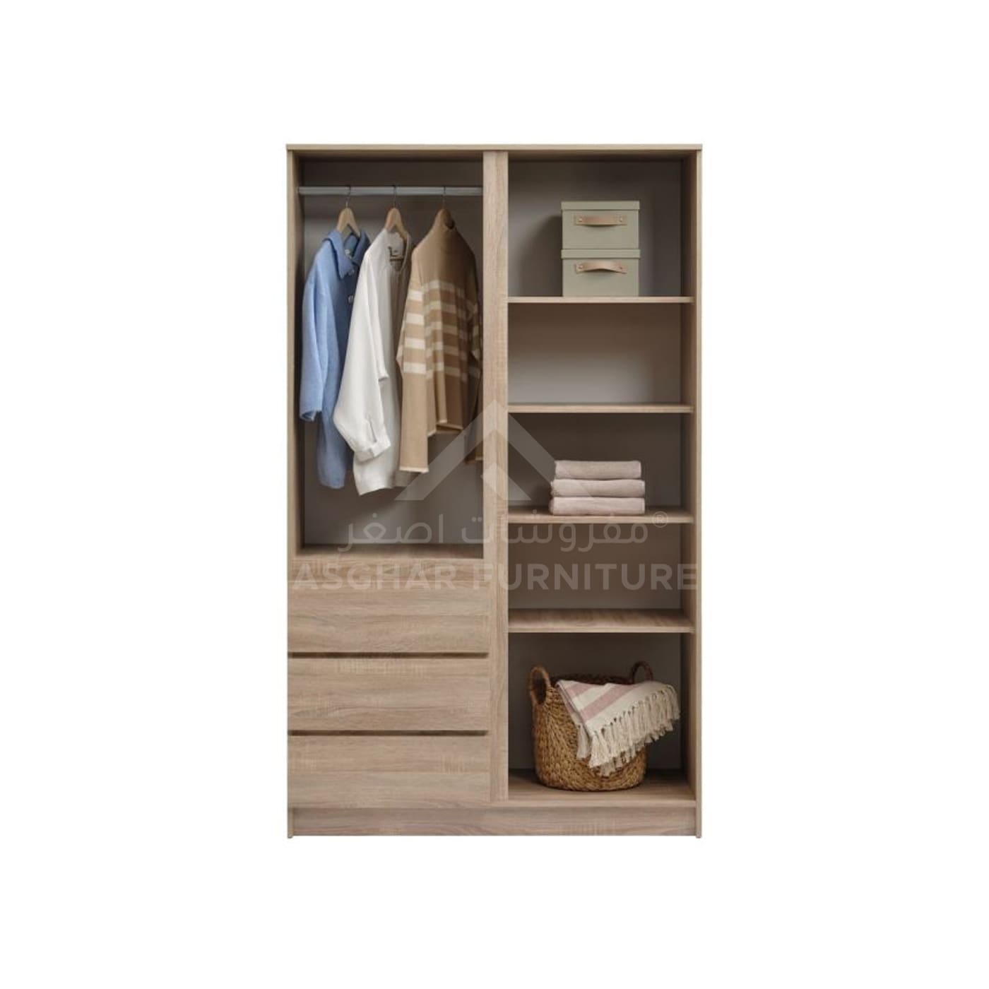Energize your room with the Mini Galaxy Wardrobe, creatively designed by Asghar Furniture. This double door wardrobe features multiple shelves on one side and a clothing rod with bottom drawers on the other, adding both functionality and stylish aesthetics to your sleeping space.